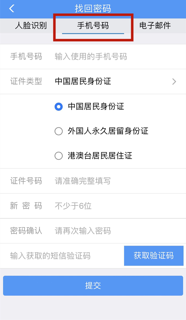 如果人脸识别不方便可以选择手机号码找回,在【找回密码】界面选择【手机号码】,输入需要填写的相关信息后点击提交即可。