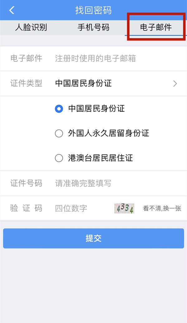 如果人脸识别和手机号码都不方便可以选择电子邮件找回密码,在【找回密码】界面选择【电子邮件】,输入需要填写的相关信息后点击提交邮箱就会收到新邮件,打开邮件查看根据提示操作即可。
