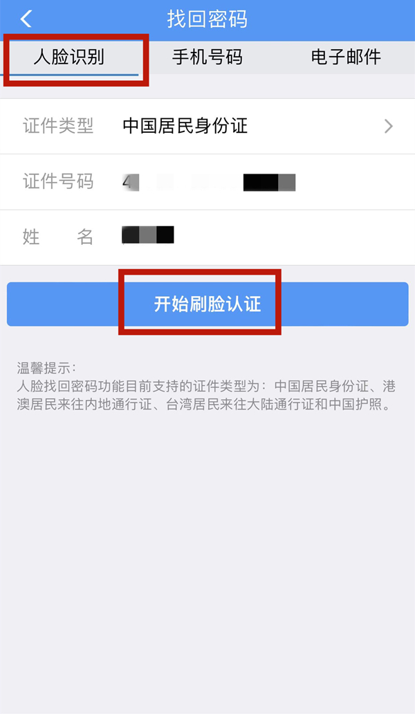 2、在找回密码界面选择【人脸识别】方式,输入身份证和姓名,输好之后点击【开始刷脸认证】。