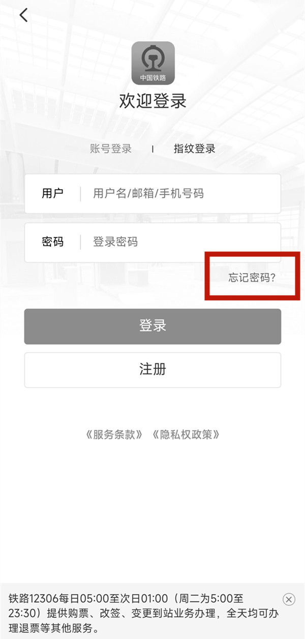 1、打开12306APP,在登录界面点击【忘记密码】。