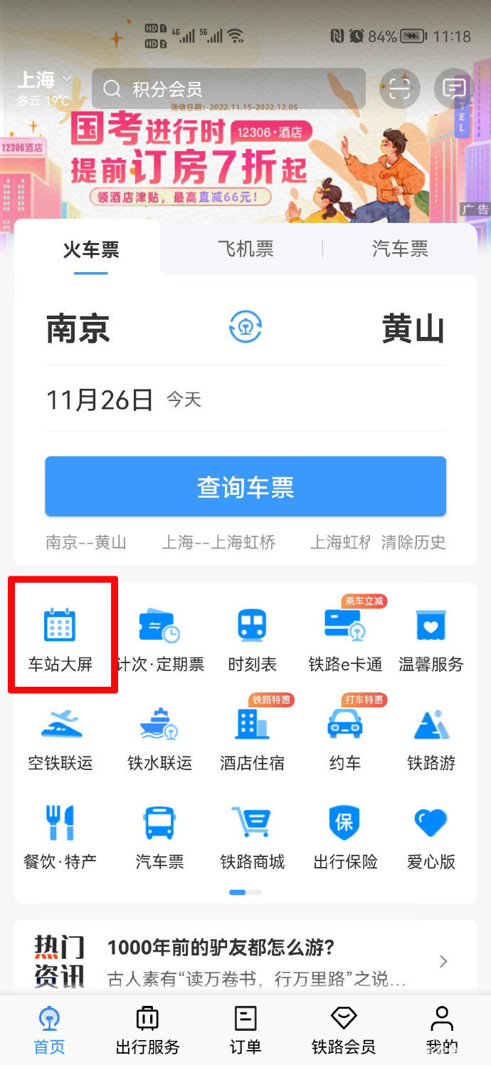 12306火车停运公告怎么查?1、打开手机12306APP,在首页点击【车站大屏】。
