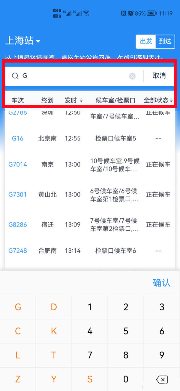 2、点击顶部搜索框,输入想要查询的车次,进入后若显示“列车运行图调整,暂停发售”即表示停运。