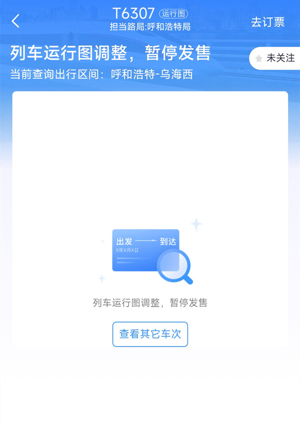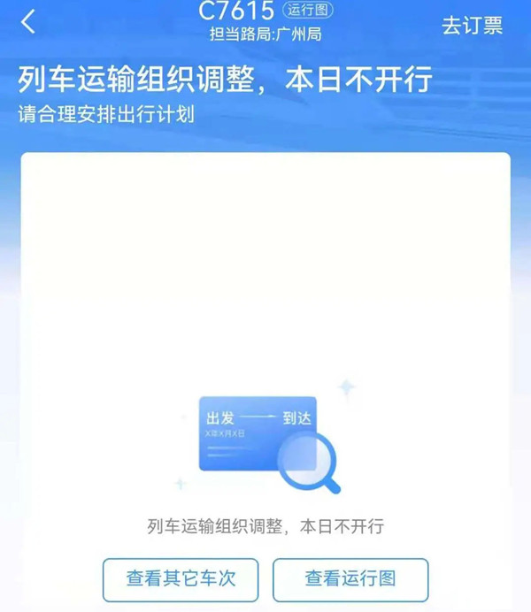 如果是已购买当天停运车次车票,页面显示的则是“列车运输组织调整,本日不开行”。