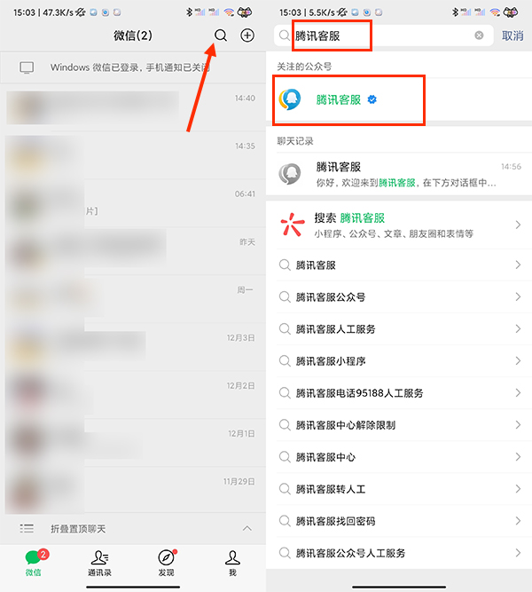 1、打开微信,点击搜索图标,搜索腾讯客服并点击进入。