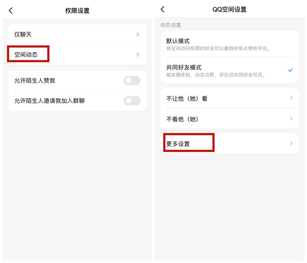3、进入权限设置界面后我们找到【空间动态】选项,跳转页面后点击【更多设置】。