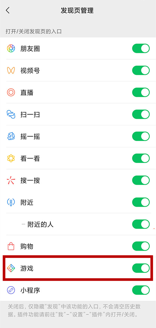 3、在发现页管理界面,将【游戏】右侧的开关打开即可。