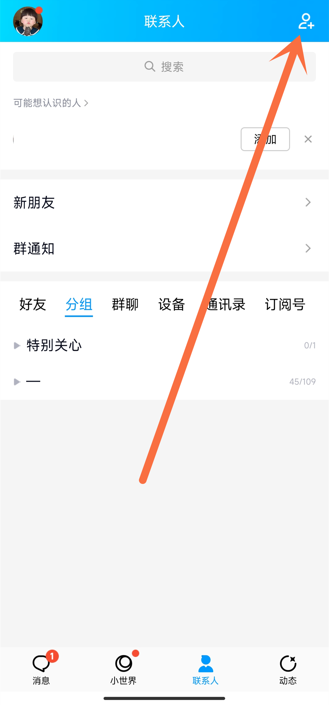 1、打开手机QQ,在联系人界面点击右侧添加图标。