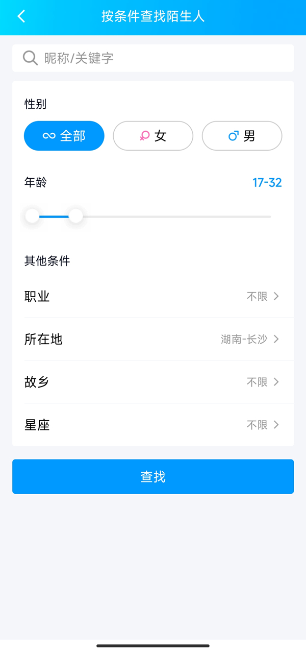 qq条件查找是指对方输入搜索地区、年龄、性别等这样的条件筛选出来的信息。使用条件查找方法添加好友的具体操作步骤如下: