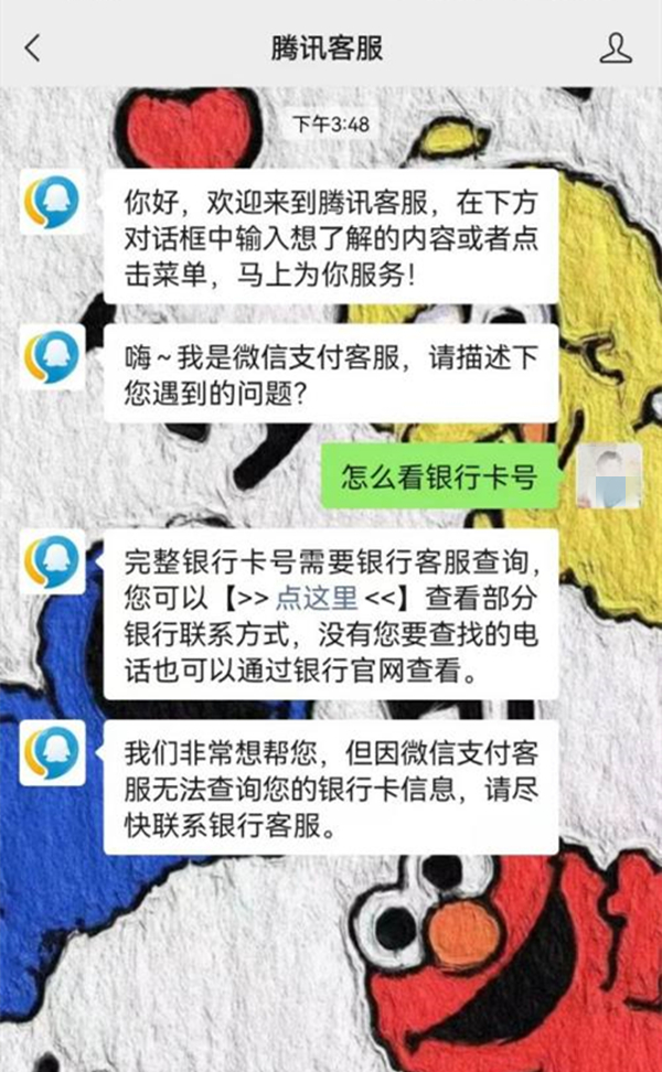 4、在客服页面,输入查看微信银行卡号,根据客服回复操作即可查看。