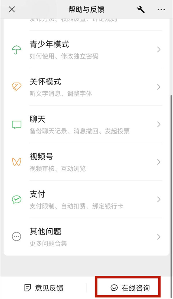 3、在帮助与反馈页面,找到右下角【在线咨询】选项,点击进入。