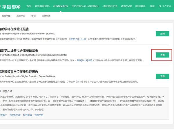 2、进入学信档案后,点击验证报告下方的【查看】。