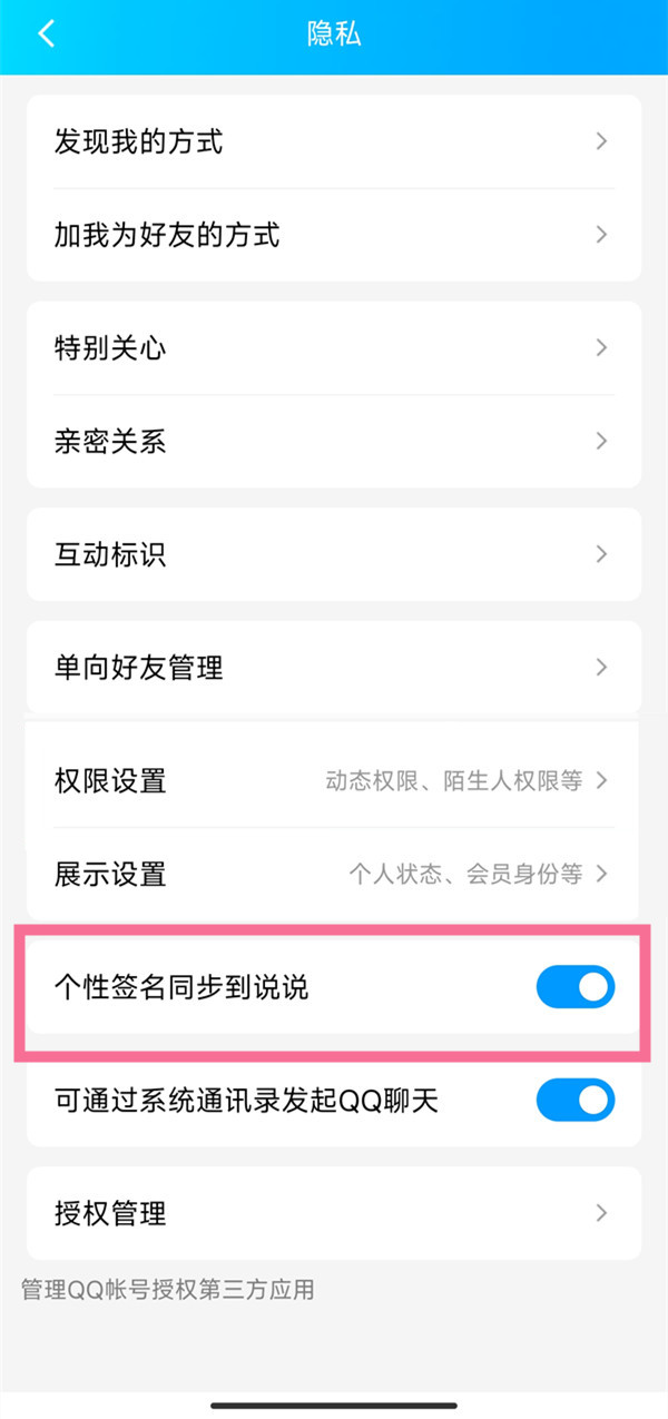 3、打开【个性签名同步到说说】右侧的开关即可。