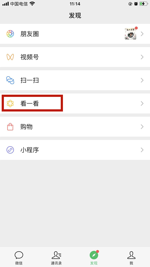 微信在看怎么不让别人看见?1、打开微信发现页面,点击【看一看】。