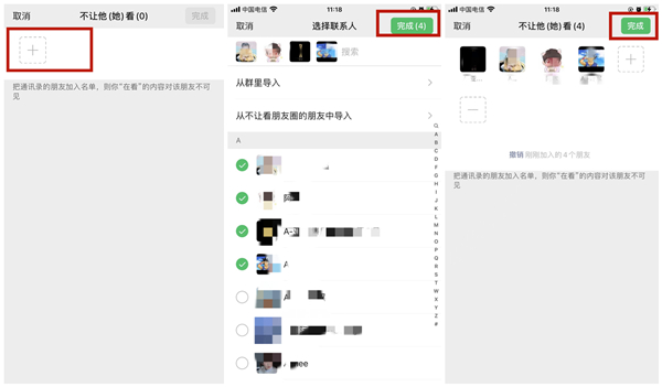 5、在不让他(她)看界面,点击【+】图标,勾选不让看的好友,点击右上角完成。选择好友之后,点击右上角完成即可。