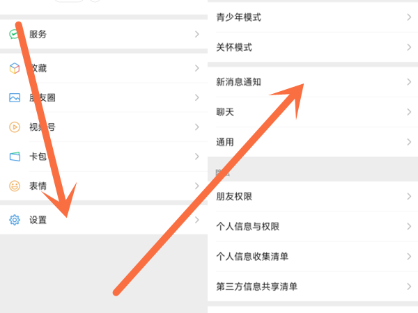 1、打开微信app,在“我”界面点击设置,再点击新消息通知。