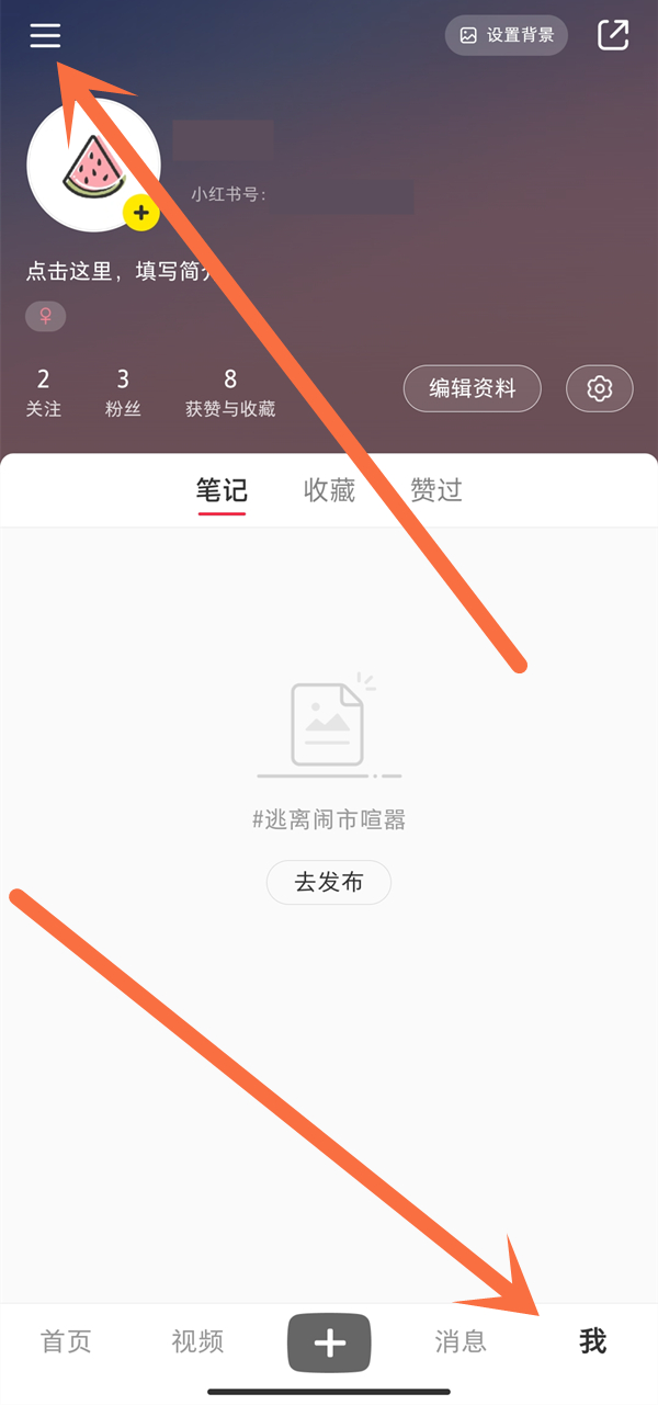 1、打开小红书app,在“我”界面点击右上角三横打开更多功能界面。