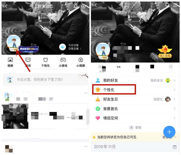 2、在我的空间界面,点击左上角的【个人头像】并打开【个性化】。