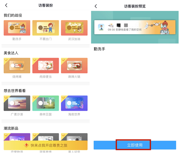 4、选择需要使用的访客装扮,预览访客装扮的效果,若满意点击【立即使用】即可。