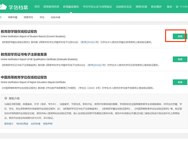 3、点击在线验证报告,点击教育部学籍在线验证报告右侧的查看。