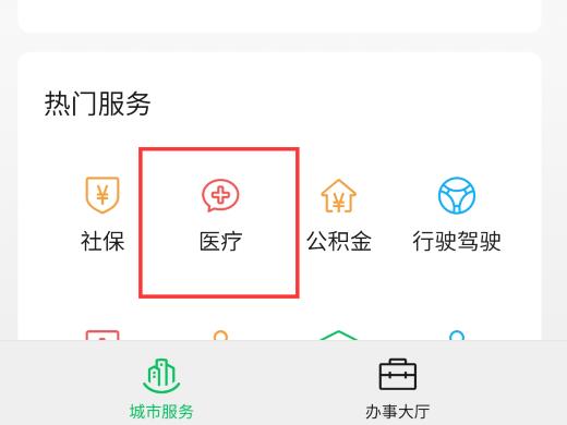 3、进入【城市服务】页面,选择【医疗】。