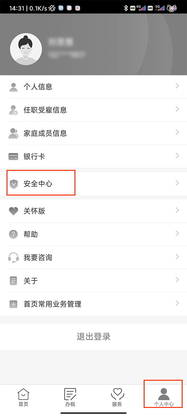 1、打开个人所得税,点击个人中心,点击安全中心。