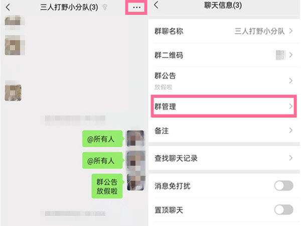 1、打开自己创建的微信群聊天界面,点击右上角三点,选择【群管理】。