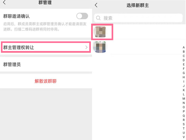 2、点击【群主管理权转让】,选择想要转让的新群主即可。