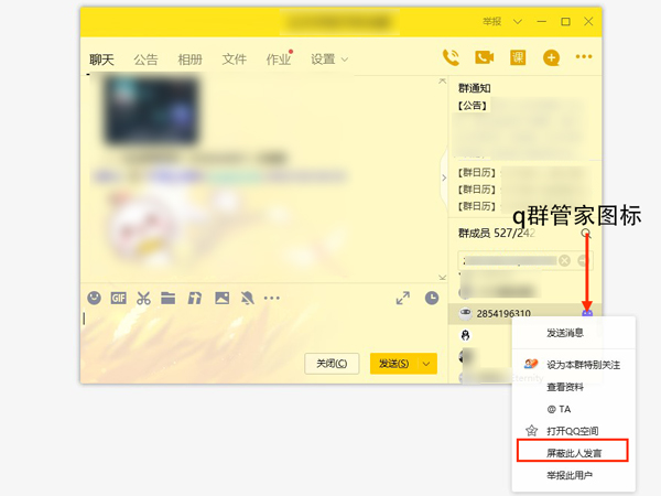 2、找到并右键单击q群管家,点击【屏蔽此人发言】即可。