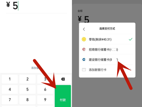 2、输入支付金额,点击付款,在选择界面,单击要选择的银行卡即可完成银行卡切换。