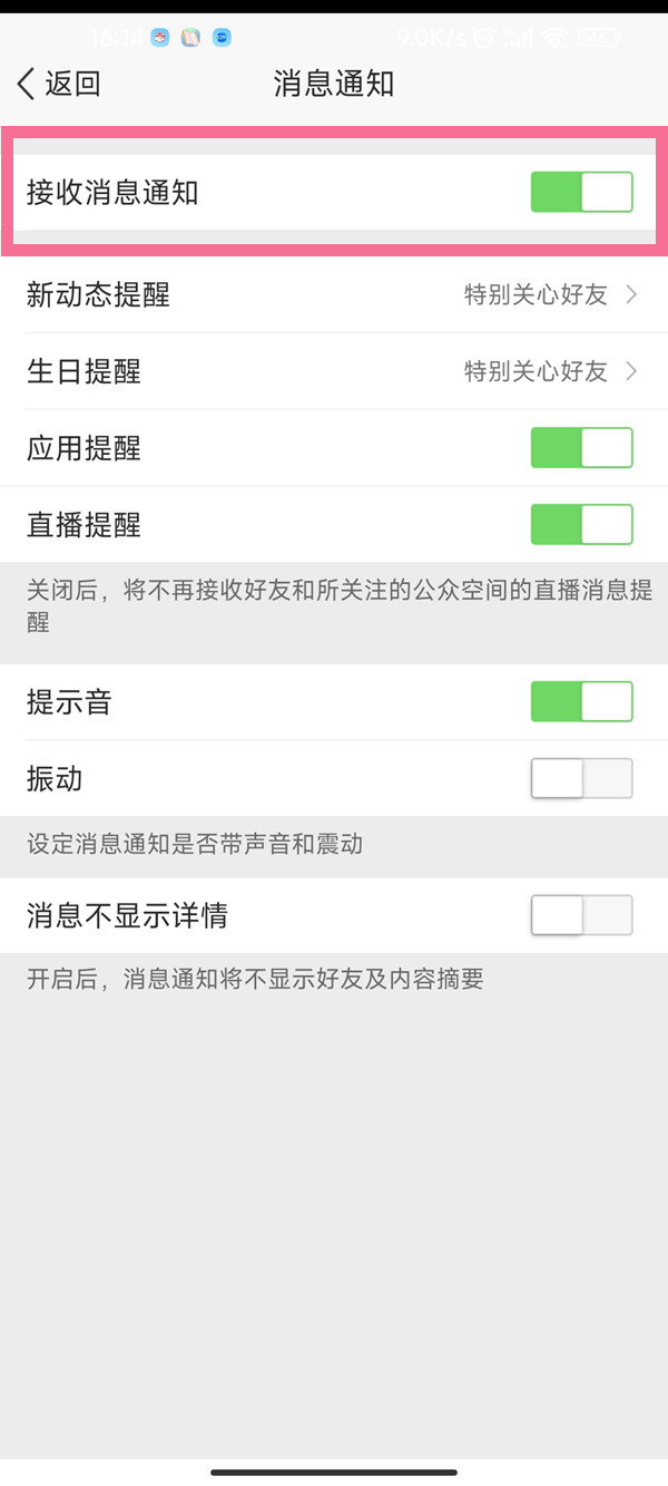 3、关闭【接收消息通知】右侧的开关即可。