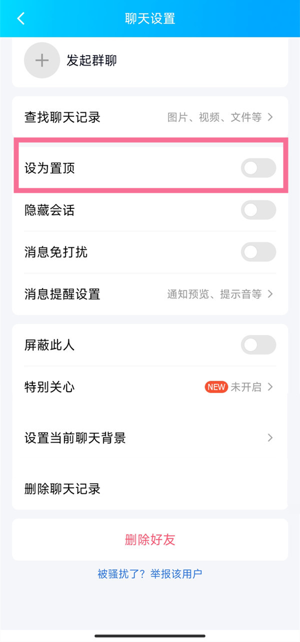 2、在聊天消息设置页面下滑,找到并打开【设为置顶】右侧的开关即可。