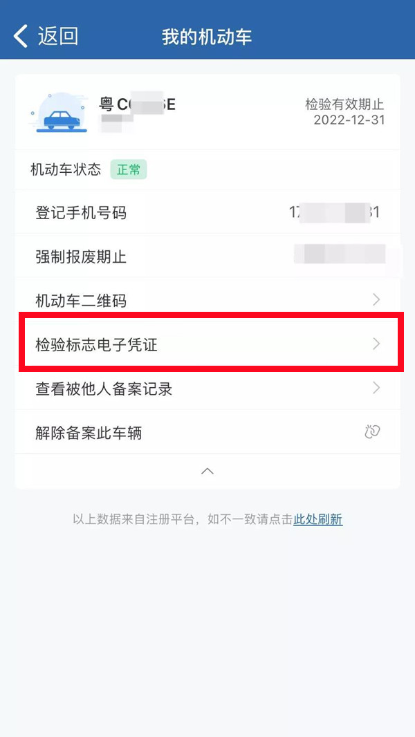 2、点击机动车状态下的箭头,选择【检验标志电子凭证】。