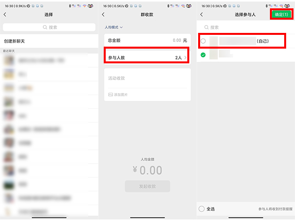 4、选择联系人,点击参与人数,取消勾选自己,点击确定。