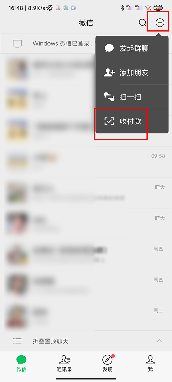 1、打开微信,点击右上【+】图标,点击收付款。