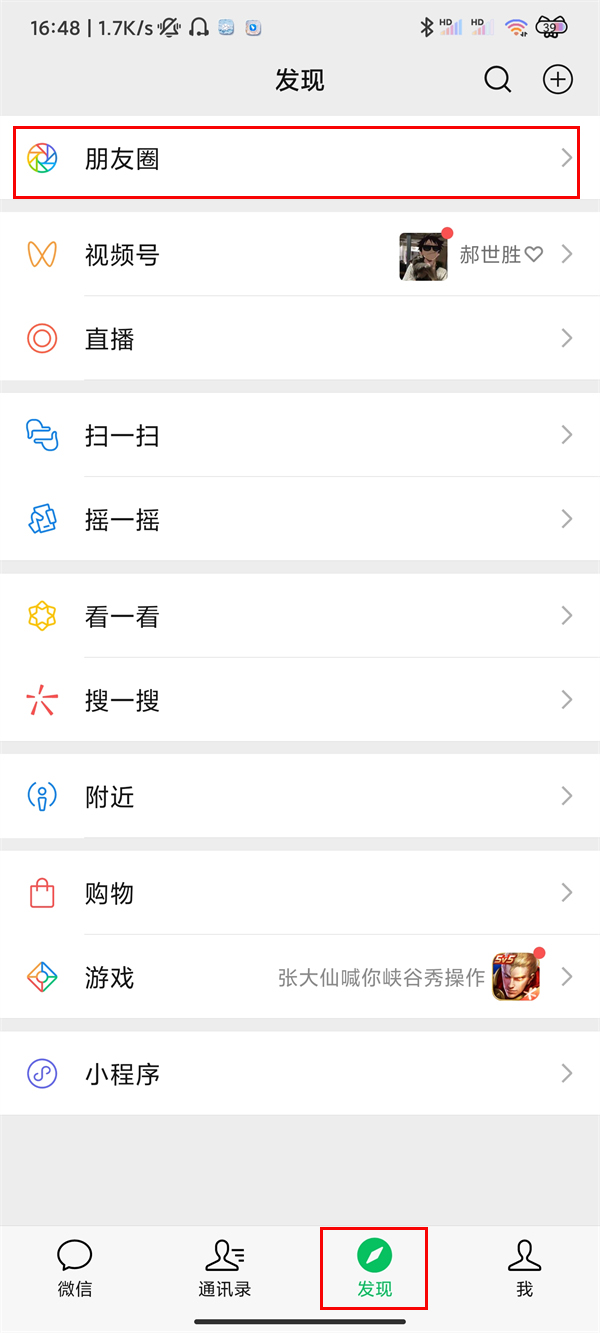 1、打开微信,点击发现,点击朋友圈。