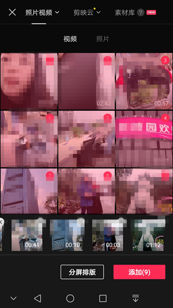 2、勾选第一个视频素材,依次全部选中所有视频。