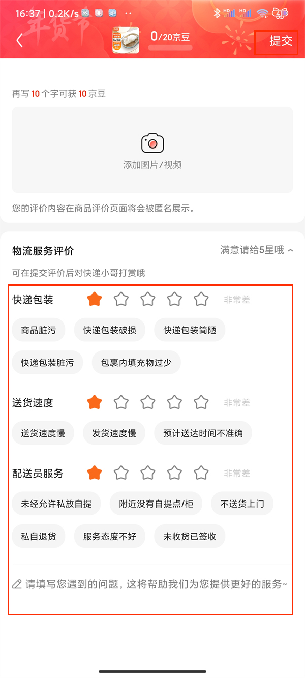 3、在物流服务评价区点一颗星,选择理由,还可在下方自行输入投诉理由,点提交。