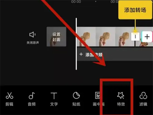 1、打开剪映APP,添加视频内容后,点击特效选项。