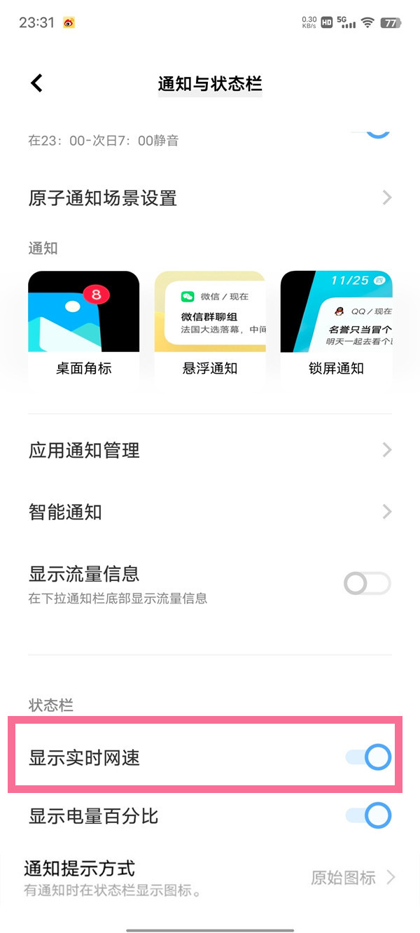 ️小编提示:若状态栏图标较多时,会优先显示比较重要的图标,如:信号栏、WiFi图标等,网速此时无法直接显示在状态栏,您可以下滑进入控制中心或通知中心查看。