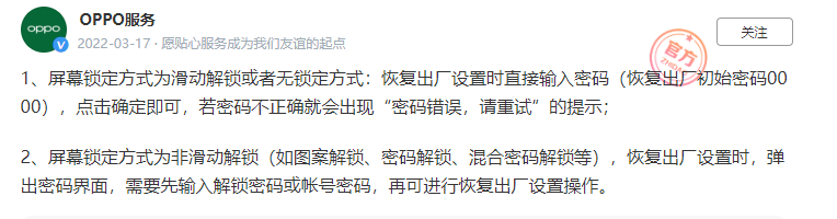 ️2、其他ColorOS 版本,手机恢复出厂设置默认的初始密码都是0000,若手机设置了锁屏密码,恢复出厂设置密码默认变为锁屏密码。