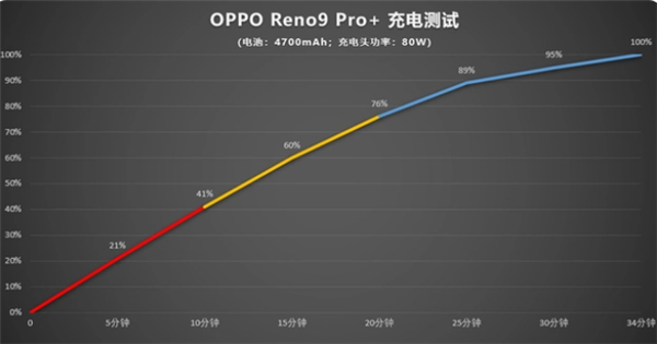 根据OPPO实验室的数据,在采用长寿版超级闪充之后,OPPO Rene9 Pro+进行1600次充放电循环(相当于4年使用损耗)其可用的电池容量依然达到了80%以上。让用户无需担忧快充损耗电池的问题。 在我们实际充电测试上,OPPO Reno9 Pro+在15分钟内电量就直接充到了60%,34分钟完整充满,速度也是非常快的。而通过配备80W的长寿版场景闪充,用户可以无需进行通宵充电,早上吃个早餐的时间,手机电量就足够一天使用了,对于使用的体验有了非常大的改善。