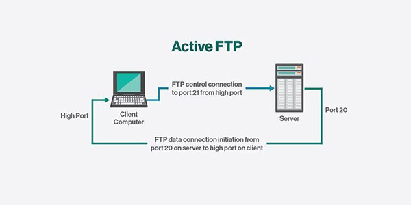 客户端在端口N上侦听来自服务器的传入数据连接,端口N可以是任何非特权端口。为了让服务器知道,它将FTP命令“端口N”发送给它。然后,服务器从其端口20(FTP服务器数据端口)建立与客户端的连接,并开始传输数据。