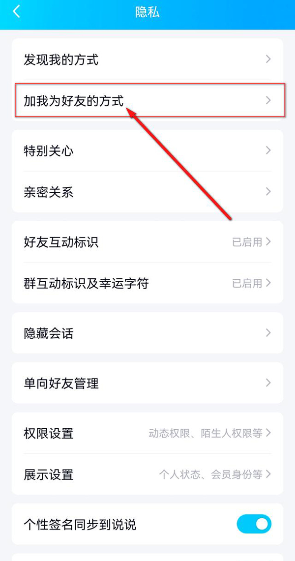 3、点击“加我为好友的方式”。