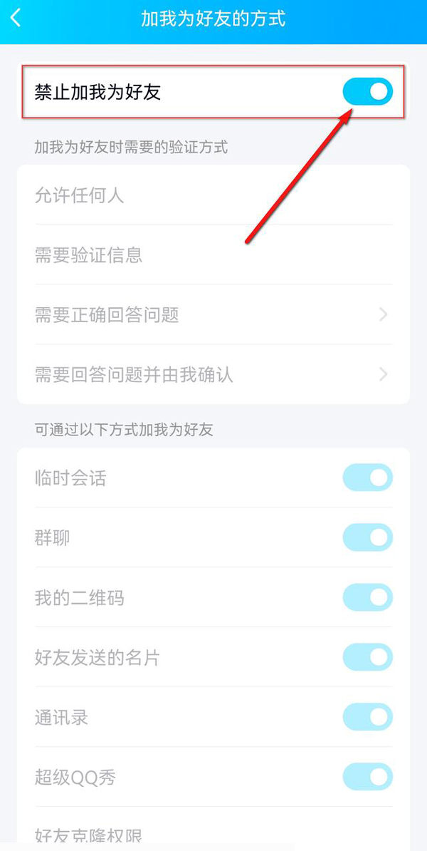 4、当“禁止加我为好友”旁的小滑块处于点亮状态时即表示此时不可加我为QQ好友,点击该小滑块,勾选加我为好友时需要的验证方式并启用加我为好友的方式途径即可。