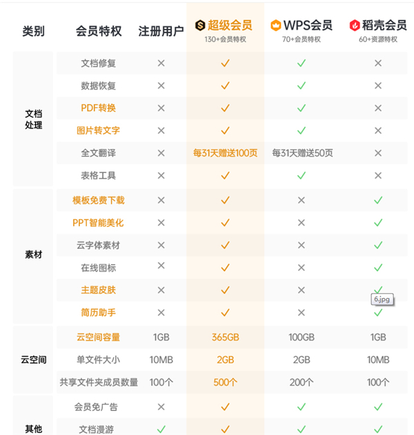 wps会员和超级会员的区别?特权不同:wps会员特权主要体现在wps文档高级功能免费。超级会员则拥有wps所有特权。云空间容量不同:wps会员的云空间容量100GB。超级会员云空间容量为365GB。功能不同:wps会员可免费使用PDF转Word、PDF编辑、找回历史版本、文档输出为长图、WPS图片编辑等高效功能。 超级会员则享有稻壳会员和WPS会员两种会员所有资源、功能和权益。