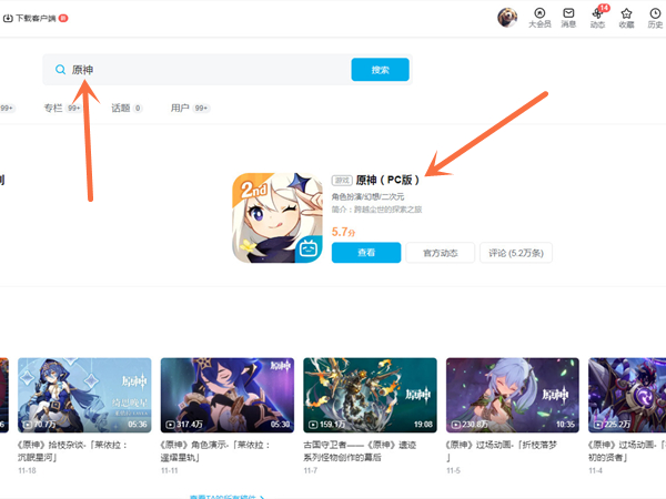 1、进入B站后,搜索框内输入原神并搜索,点击原神进行查看。