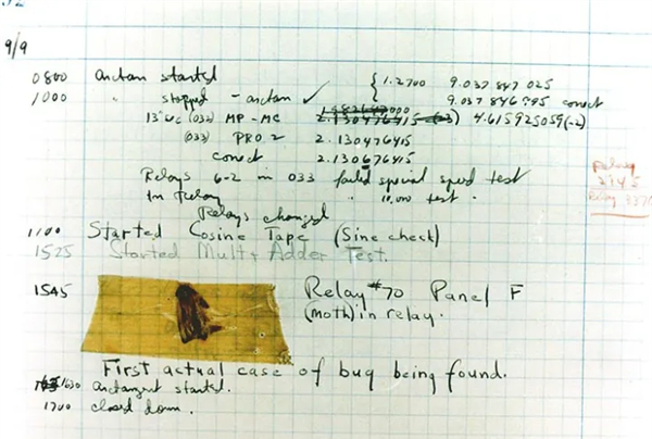 “Bug”的创始人格蕾丝·赫柏(Grace Murray Hopper),是一位为美国海军工作的电脑专家,也是最早将人类语言融入到电脑程序的人之一。而代表电脑程序出错的“bug” 这名字,正是由赫柏所取的。1947年9月9日,赫柏对Harvard Mark II设置好17000个继电器进行编程后,技术人员正在进行整机运行时,它突然停止了工作。于是他们爬上去找原因,发现这台巨大的计算机内部一组继电器的触点之间有一只飞蛾,这显然是由于飞蛾受光和热的吸引,飞到了触点上,然后被高电压击死。所以在报告中,赫柏用胶条贴上飞蛾,并把“bug”来表示“一个在电脑程序里的错误”,“Bug”这个说法一直沿用到今天。