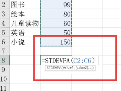1、在数据单元格的下方输入标准差公式函数公式“=STDEVPA(C2:C6)”。