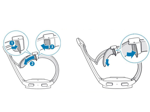 2、拨开按扣,将表带插入带扣孔,调节表带,然后按上按扣。插入表带后,若要拨开按扣,向下拉动表带即可。