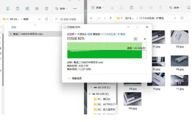 小米Type-C五合一扩展坞配置的是三个USB3.0接口,理论速率5Gbps传输速度可达450MB/秒。亲测,从小米U盘拷贝大文件到小米笔记本电脑,峰值速度高达145MB/S,几乎跑满U盘的极限速度,满足高速传输需求,外接键盘、鼠标更是不在话下。